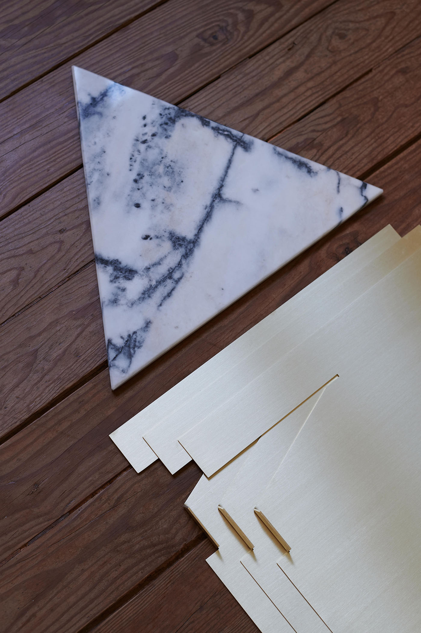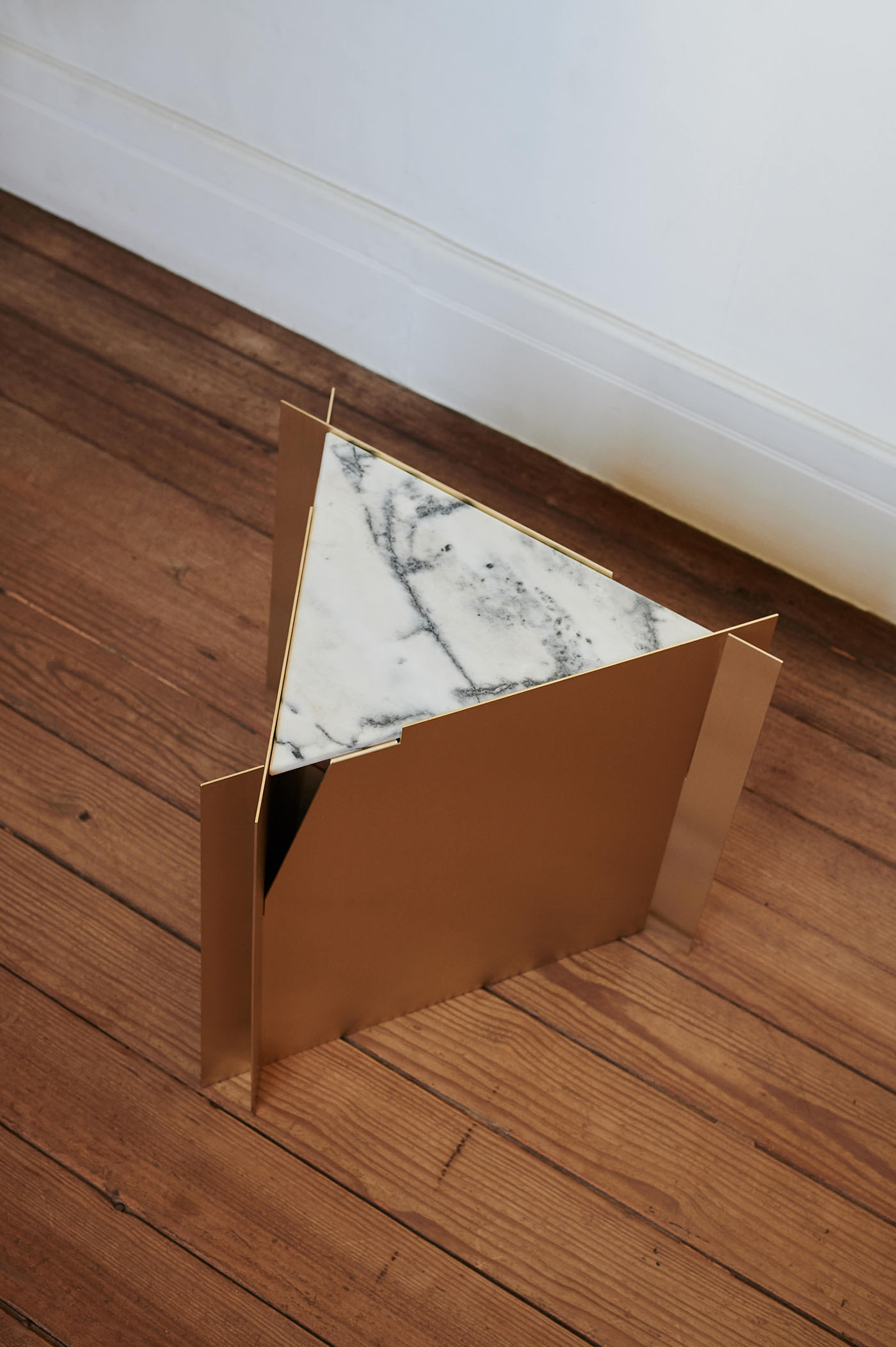 Three metal pieces are cut following a 2d pattern. The assembly takes place in three-dimensional space, in a gesture of precision and sensitivity. Without fasteners, screws or welding, gravity ensures assembly.